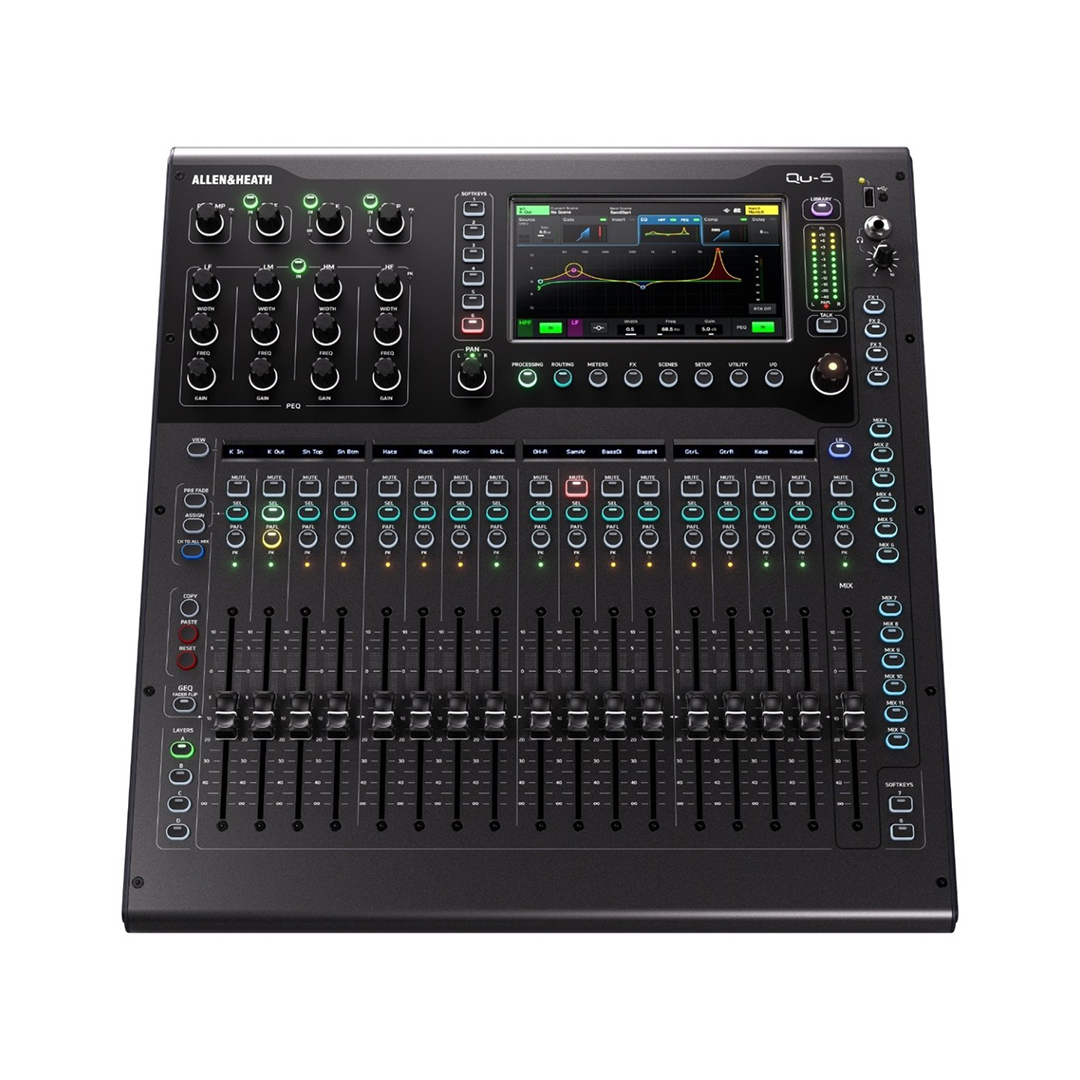 Diseñado para máxima flexibilidad, el Allen & Heath Qu-5D ofrece una configuración de E/S altamente versátil con 36 entradas de mezcla, incluyendo 32 canales mono (enlazables para operación estéreo) y dos canales estéreo dedicados. Su arquitectura de salida incluye un bus LR principal estéreo, 12 salidas de mezcla (seis auxiliares mono o enlazables) y seis mezclas auxiliares/de grupo estéreo; y cuatro salidas de matriz que también pueden configurarse como pares estéreo.