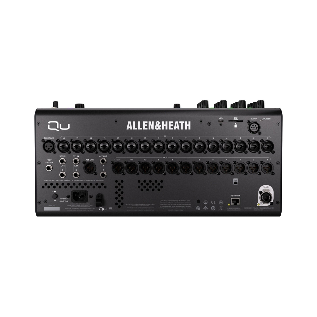 Para la conectividad física, el Qu-5D incluye 16 conectores XLR combo de micrófono/línea, dos pares de entradas de línea estéreo (cada uno con dos conectores TRS) y una entrada de intercomunicación dedicada. En cuanto a las salidas, ofrece 12 salidas XLR, dos salidas TRS y una salida digital estéreo AES3, lo que garantiza una integración perfecta tanto en entornos de producción de sonido en vivo como en estudio.