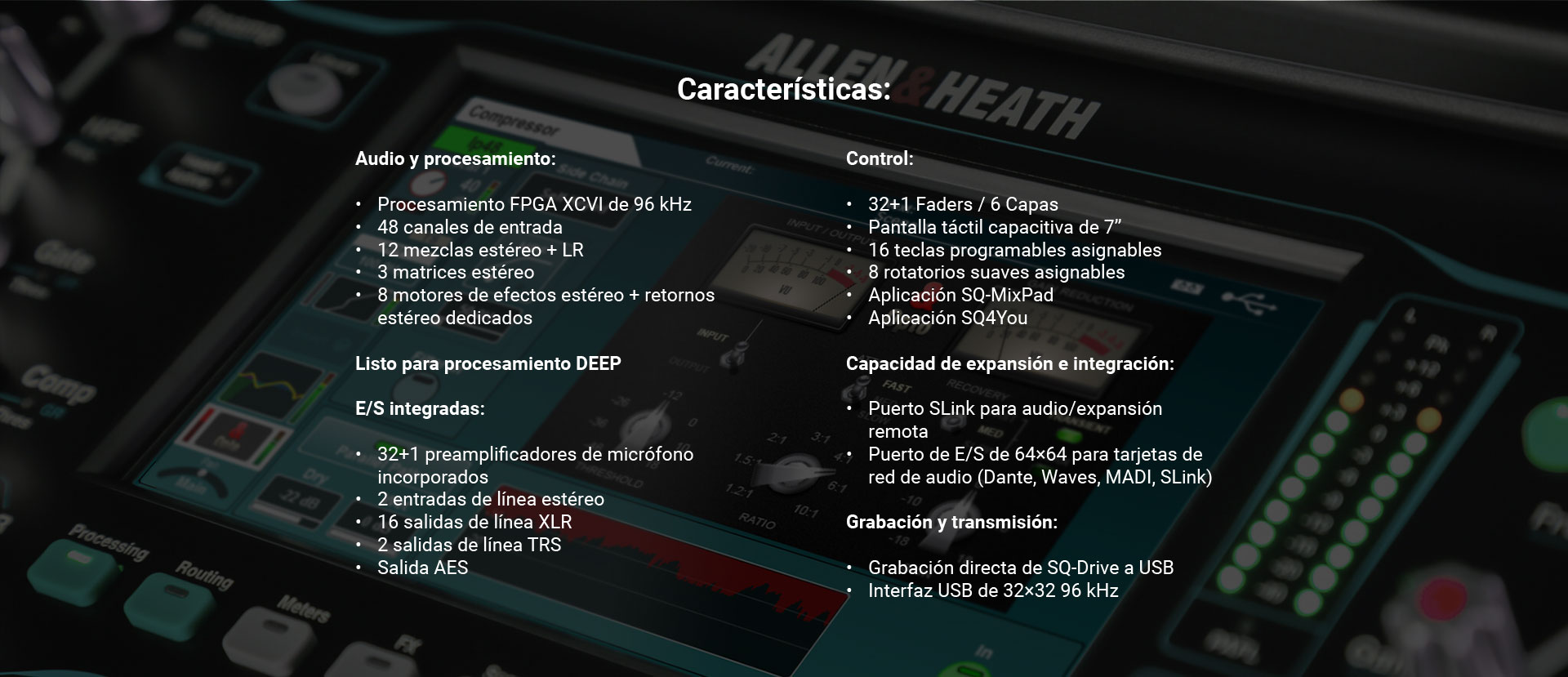 El Allen & Heath SQ-7 es el mezclador más grande de la serie SQ, diseñado para satisfacer las necesidades de los profesionales del audio más exigentes. Con 32+1 faders, 32+1 preamplificadores integrados, 16 teclas programables y 8 controles rotatorios programables asignables, el SQ-7 ofrece un control y una personalización inigualables.